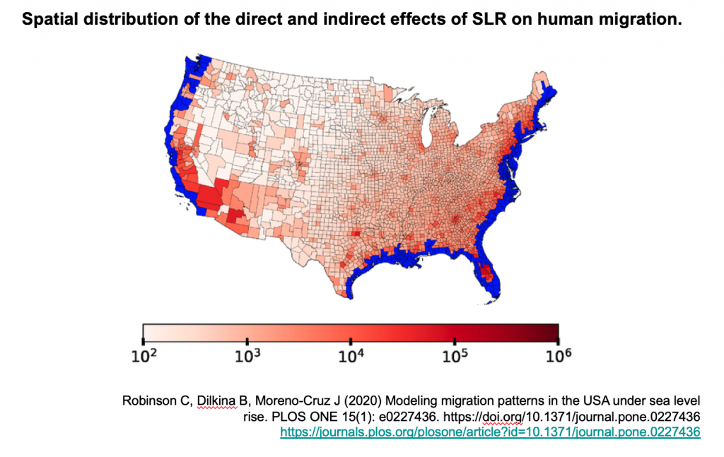 The blue shows the counties projected to have significant flooding and lose population. The shades of red, from light pink to deep red shows population influx. (To translate the scientific legend, the exponent is the number of zeros; e.g. 10 to the 4th power, is 10,000 people and 10 to the 6th is a million.)